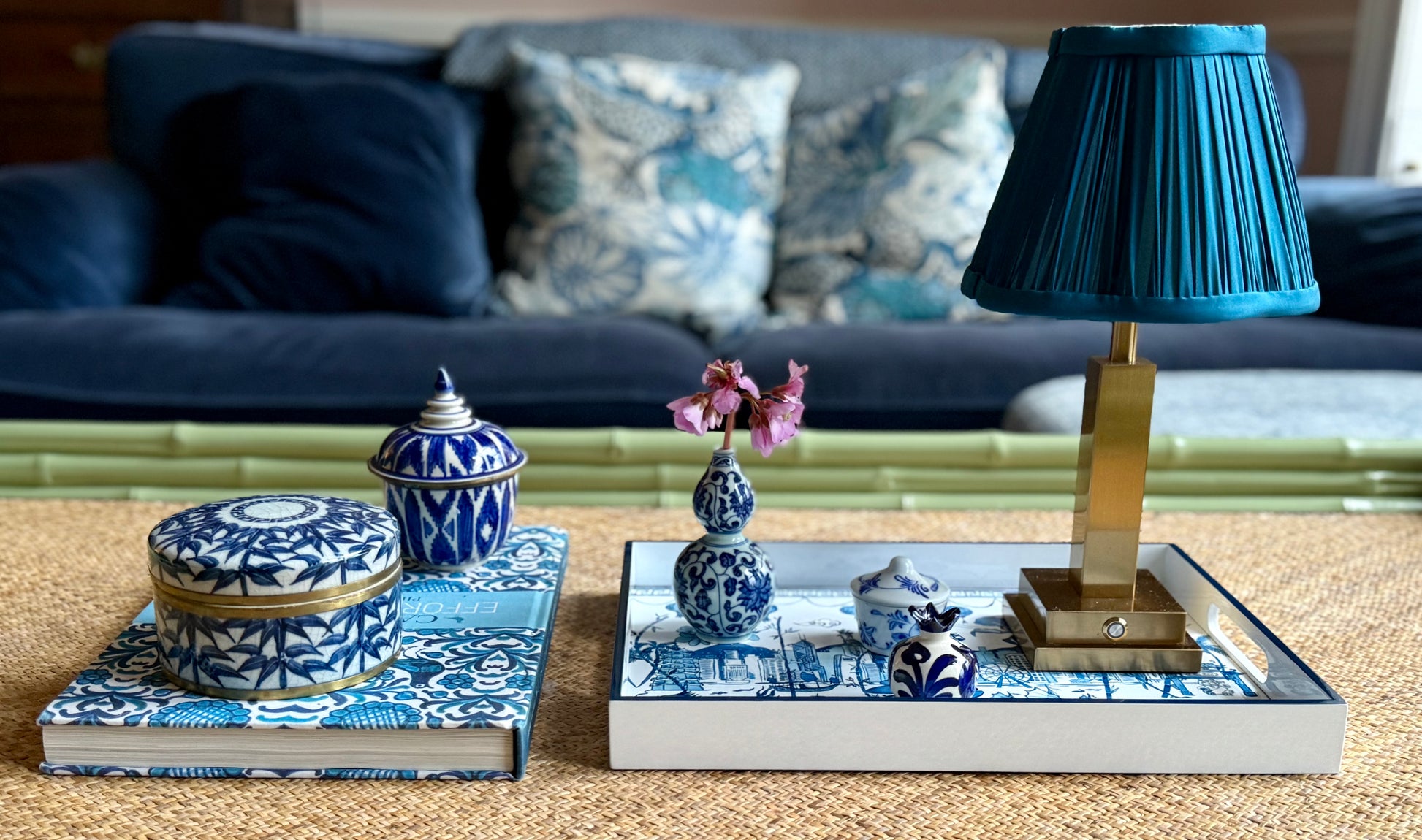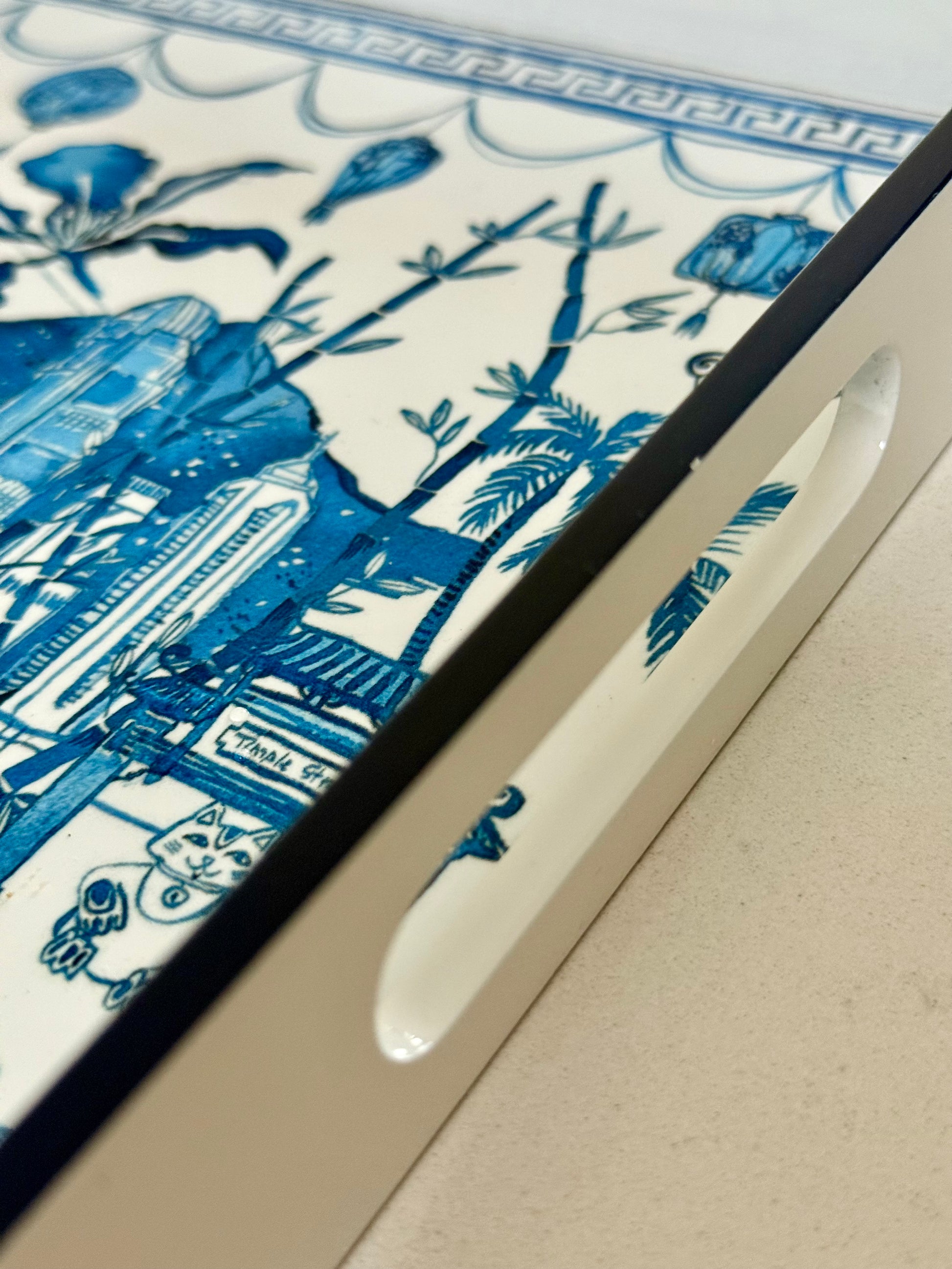 In glorious blue & white with blue edge detailing & side handles for easy carrying, the tray depicts the daily details of HK life against a backdrop of Victoria Peak & Harbour.