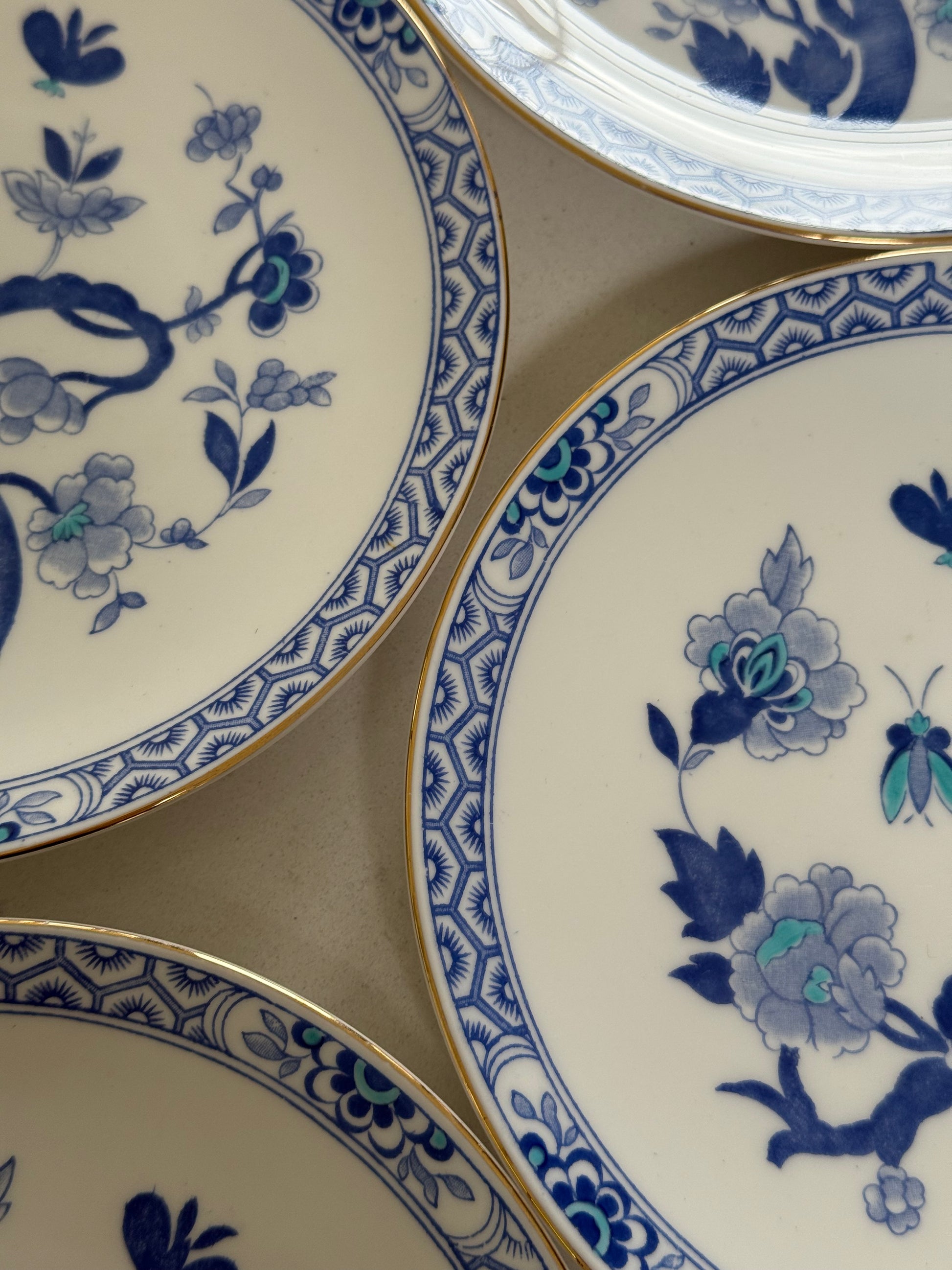 Featuring a delicate blue and white floral design with intricate border pattern & gold edging.